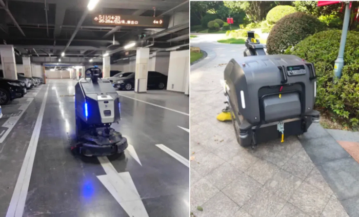 其中,清洁机器人的存在感更低,但效率更高。地下车库、室外道路、家门口和电梯间,都能看到按照固定路线工作的机器人。