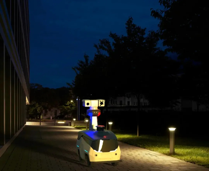 一台半米高灰色机器,闪着蓝色的呼吸灯,匀速滑过入夜的居民楼下。它会在扫描路边的灌木丛、小区的快递柜后,再平稳驶过地下车库的减速带,排除掉潜在的安全隐患后,又开始新一轮巡逻。