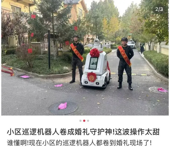 机器人批量入职物业,未必代表人情味缺失。巡逻机器人在小区里新人结婚时还能担任吉祥物,屏幕播放新人照片,协助接亲队伍通过。