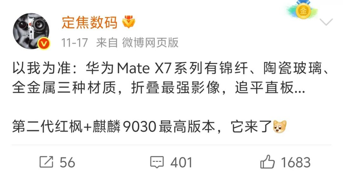 更有爆料称,Mate X7将搭载麒麟9030的“满血版”,该版本采用类似“Max”的强化规格,性能表现预计将实现进一步跃升。