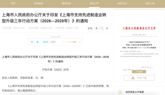 1月9日,据上海市人民政府网站消息,上海市人民政府办公厅印发了《上海市支持先进制造业转型升级三年行动方案(2026—2028年)》(以下简称《行动方案》)。方案明确实施结构调优升级、创新攻关强基、能级质效跃升、资源要素支撑四大行动,并提出了17条具体举措。本方案自2026年1月1日起实施,有效期至2028年12月31日。