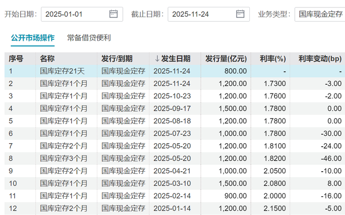 财政部、中国人民银行于20251124日以利率招标、多重价位中标方式进行了2025年中央国库现金管理商业银行定期存款(十二期)招投标。该期中标总量为800亿元;期限为21天,起息日为20251124日,到期日为20251215日。