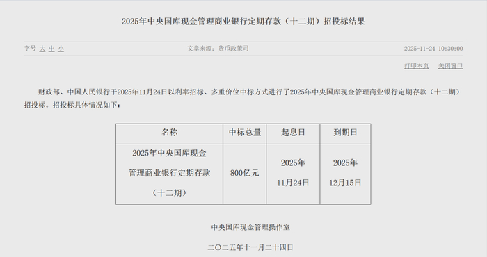 1124日,央行官网公布2025年中央国库现金管理商业银行定期存款第十一期、第十二期招投标结果。