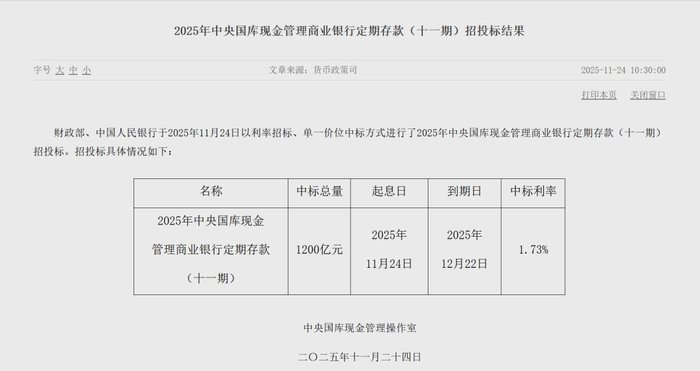 财政部、中国人民银行于20251124日以利率招标、单一价位中标方式进行了2025年中央国库现金管理商业银行定期存款(十一期)招投标。该期中标总量为1200亿元;期限为1个月,起息日为20251124日,到期日为20251222日;中标利率为1.73%,较上次下降3BP