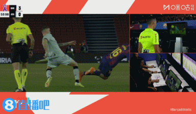 第52分钟,桑塞特回防时踢倒了费尔明,主裁判向其出示黄牌,随后VAR介入,主裁判观看大屏幕后取消黄牌判罚,直接红牌罚下桑塞特。↓