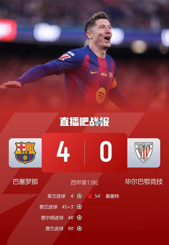 直播吧11月23日讯 北京时间11月22日23:15,2025-26赛季西甲联赛第13轮,巴塞罗那重回诺坎普球场迎战毕尔巴鄂竞技。上半场莱万破门,费兰补时打进单刀球,巴萨暂2-0毕尔巴鄂竞技;下半场费尔明破门,桑塞特直红,比赛最后时刻亚马尔助攻费兰单刀再下一城,最终巴萨4-0十人毕尔巴鄂竞技,回到诺坎普首战开门红,先赛积分追平皇马。