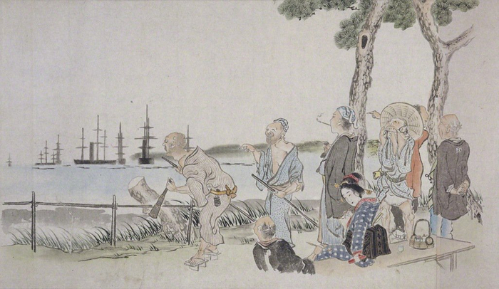 人们在子安村(现横滨市的一部分)观看黑船。图片出自《黑船来访风俗绘卷》(黑船来访风俗绘卷)。(图片来源:埼玉县历史民俗博物馆)