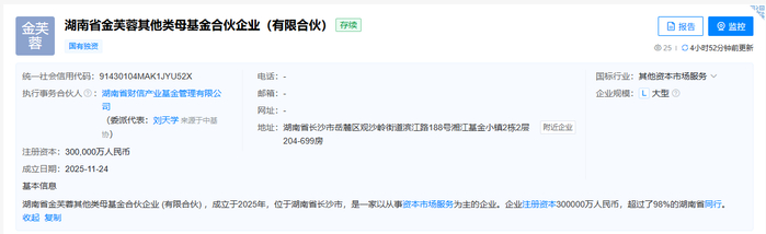 投资界(ID:pedaily2012)11月27日消息,天眼查工商信息显示,近日,湖南省金芙蓉其他类母基金合伙企业(有限合伙)成立,执行事务合伙人为湖南省财信产业基金管理有限公司,出资额30亿人民币,经营范围为以私募基金从事股权投资、投资管理、资产管理等活动。合伙人信息显示,该基金由湖南省新兴产业引导投资合伙企业(有限合伙)、湖南省财信产业基金管理有限公司共同出资。
