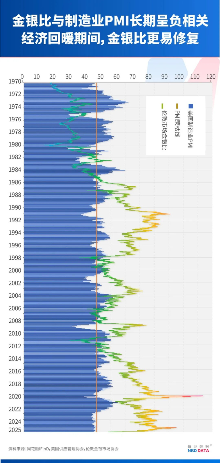 回溯1980年以来,每轮金银比修复都伴随着美国PMI回暖(回归荣枯线50%以上),几乎无一例外。这也加固了传统认知中金银比的修复路径:经济复苏—制造业PMI回升—白银工业需求增加—银价涨幅超金价—金银比回落。