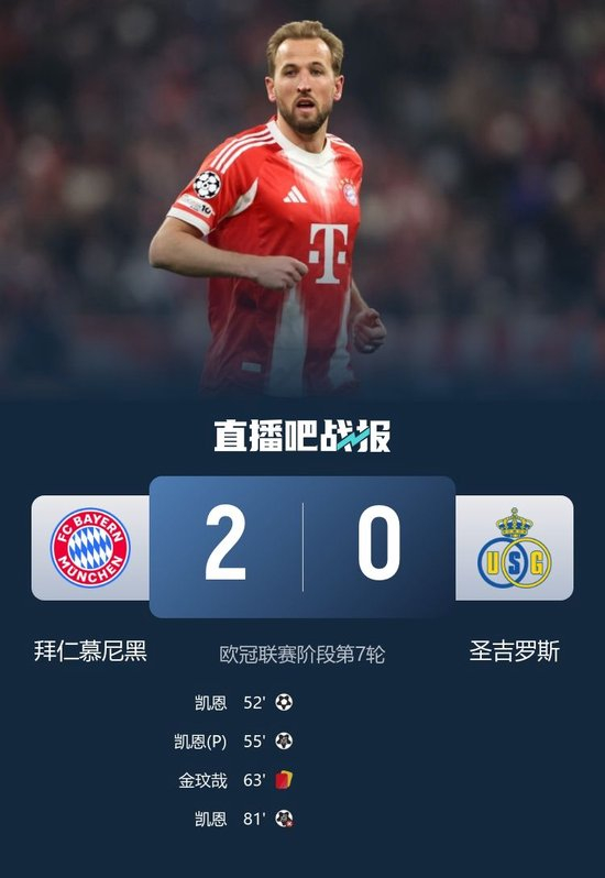 直播吧1月22日讯,北京时间4:00,欧冠联赛阶段第7轮,拜仁慕尼黑对阵圣吉罗斯,比赛在安联球场打响!上半场,金玟哉染黄,诺伊尔神扑救险。下半场,凯恩在3分钟内完成进球、造点和点射,梅开二度!金玟哉两黄变一红被罚下;奥利塞造点,凯恩第二次主罚点球时皮球击中门框。最终,十人拜仁2-0击败圣吉罗斯,提前一轮锁定小组前八,晋级欧冠16强!