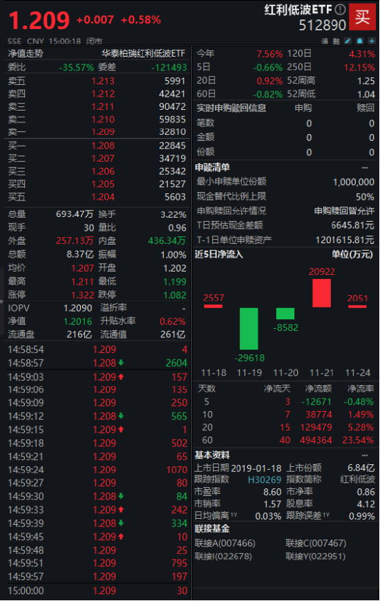 11月25日消息,A股市场呈现冲高回落态势,三大指数早盘集体高开高走,午后涨幅收窄,最终全线收涨。受此影响,红利低波ETF收盘(512890)上涨0.58%,报1.209元,换手率3.22%,成交额8.37亿元,成交规模居同类ETF首位。