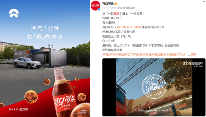 另一方面,可口可乐不断推陈出新。在产品层面,推出无糖系列、纤维+产品、迷你罐等,精准回应年轻人对健康、个性化与趣味性的多元需求。在营销层面,品牌亦积极融合新技术、新场景与新伙伴。比如,与蔚来汽车合作“3分钟让‘电’与‘乐’量加满”,探索出行场景下的快乐体验;又如联名CONVERSE中国,以“穿越回1886年”的创意,将CHUCK鞋款与可口可乐诞生时间结合,用经典叙事,让两个IP在复古与潮流之间碰撞出新的火花。