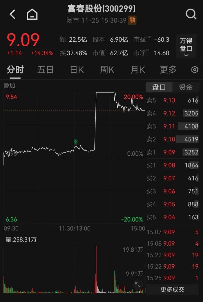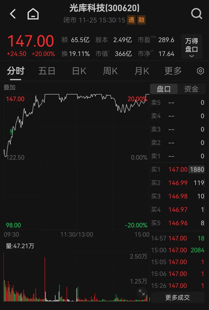 游戏股午后放量拉升,其中富春股份(300299)直线20%涨停。通信设备股集体大涨,光库科技(300620)临近收盘最后5分钟20%涨停。